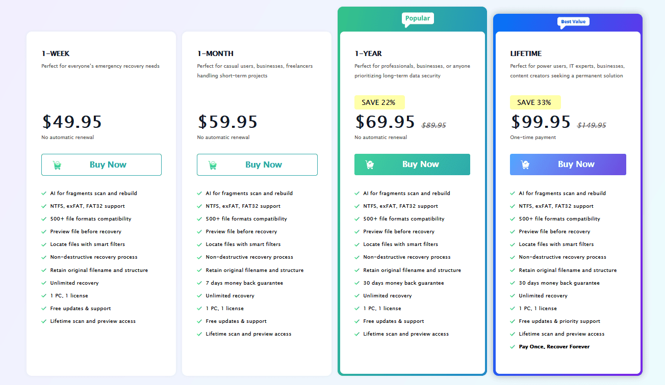 - Weekly Plan: $49.95 (ideal for one-time recovery needs).